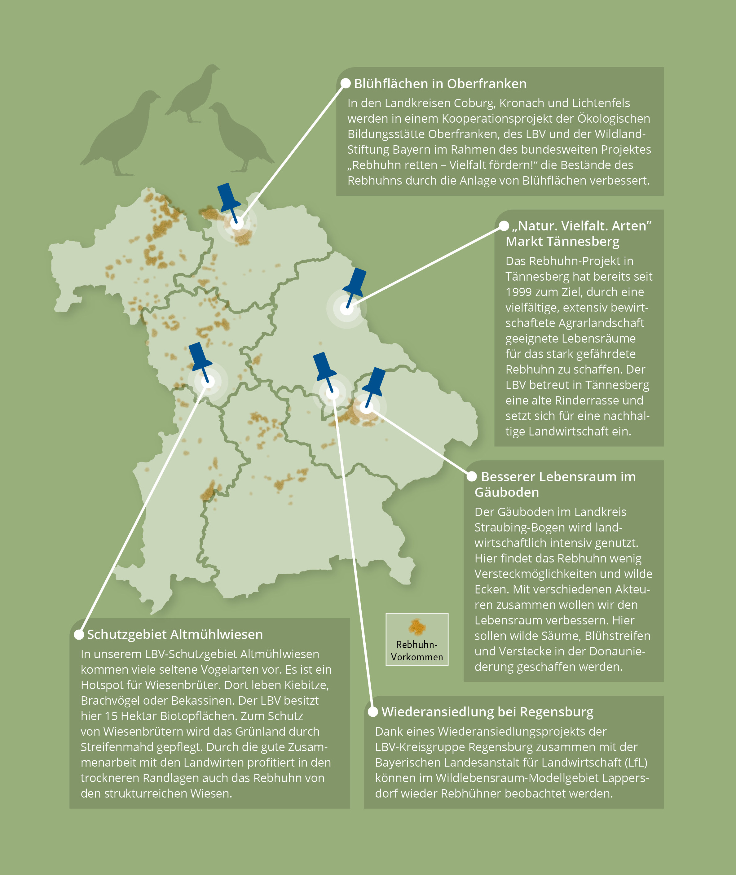 Das Rebhuhn war in Bayern bis in die 1980er-Jahre ein vertrauter Anblick. Seither haben wir mindestens 90 Prozent der Bestände verloren. Unsere Landschaft hat sich verändert Der Einsatz von Pestiziden und Düngemitteln führen zu Agrarwüsten.