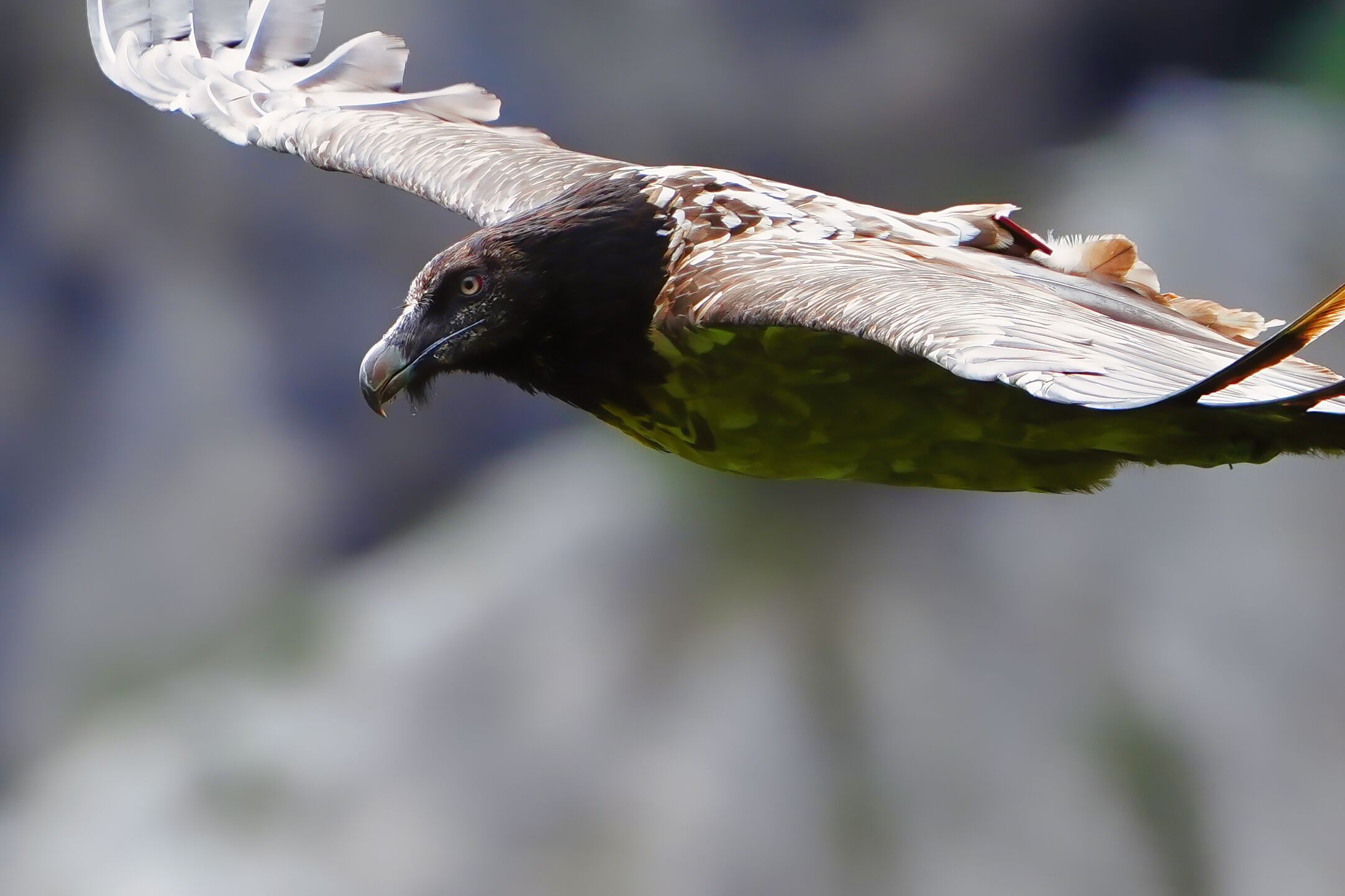 Im letzten Jahr war der zweite der eingerichteten Futterplätze schon deutlich weniger besucht, als die beiden anderen – heuer gelang dies sogar noch keinem der beiden. Die beiden anderen Plätze werden aber gut angenommen, so dass die Versorgung kein Problem darstellt. Wir hatten ja schon direkt nach Sisis Erstflug beobachtet, dass sie in einer Felsrinne einige Knochen finden konnte. Inzwischen kam dies mindesten in noch einem anderen Fall vor, in dem sie ein mutmaßliches Gamsskelett in den zerklüfteten Wänden des Knittelhorns entdecken konnten. Gelegentlich konnten sie auch schon dabei beobachtet werden, wie sie Knochen an andere Orte transportieren, um sie dort dann zu konsumieren.