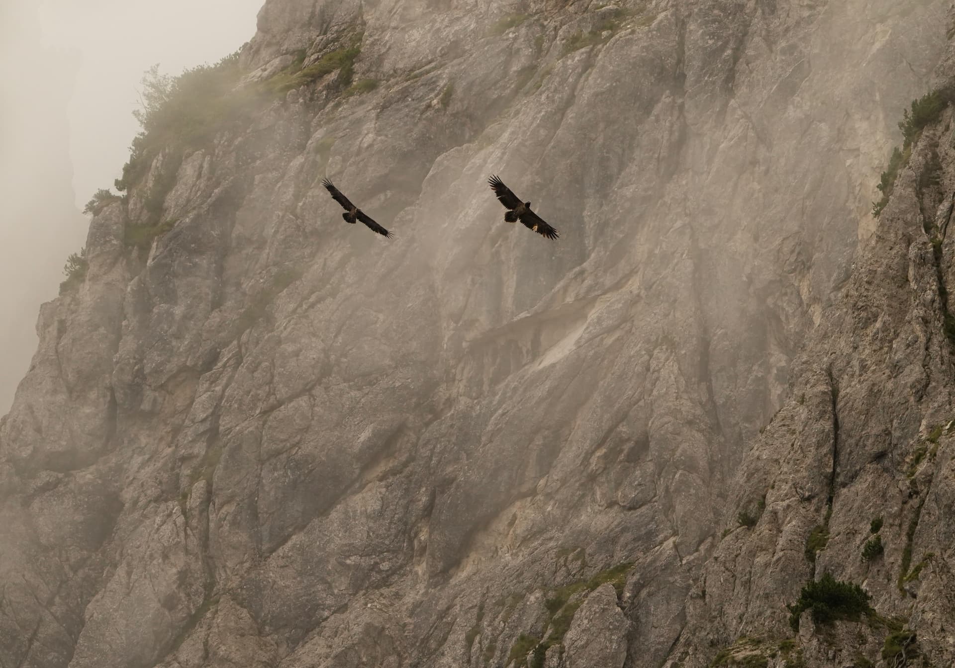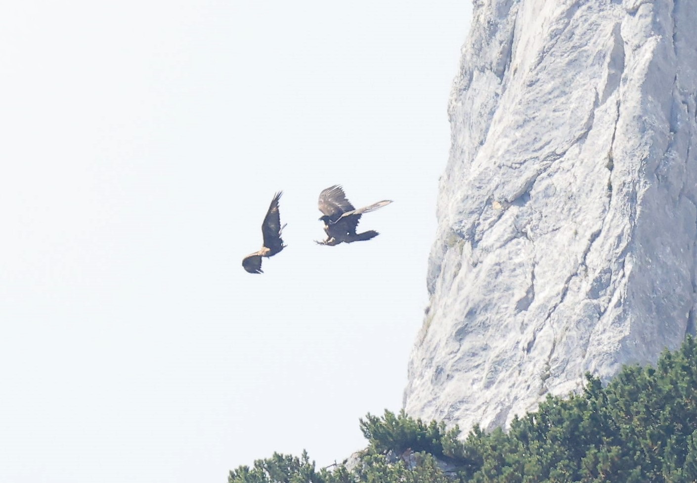 Selbstverständlich kommt es regelmäßig zu Begegnungen mit dem ansässigen Steinadlerpärchen. Aufgrund der bisherigen Beobachtungen und Ereignisse gibt es auch keinen Grund zur Sorge: Die jungen Bartgeier sind inzwischen deutlich besser darin, die Thermik zu nutzen und bringen sich dadurch häufig in vorteilhaftere Positionen.