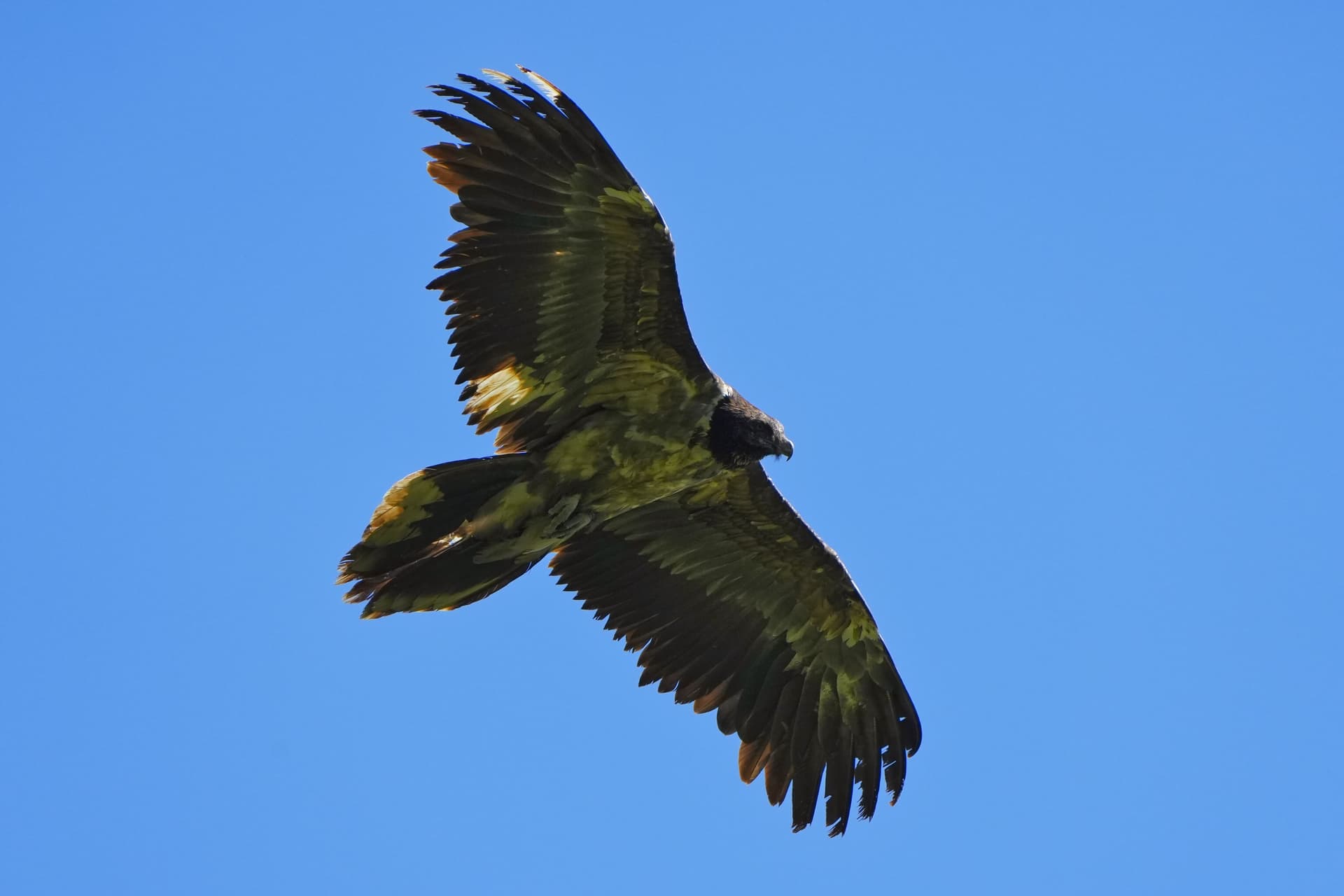 Nepomuks Markierung ist im September 2025 nicht mehr ganz einfach zu erkennen. Am besten sieht man die Bleichung noch an den ersten beiden Handschwungfedern auf der rechten Seite. Allerdings sind nur die ersten paar Zentimeter an der Spitze der beiden Federn eingefärbt. Die Markierungen an den inneren Armschwungfedern (22-24) rechts und der rechten Schwanzseite sind nur noch sehr undeutlich zu erkennen