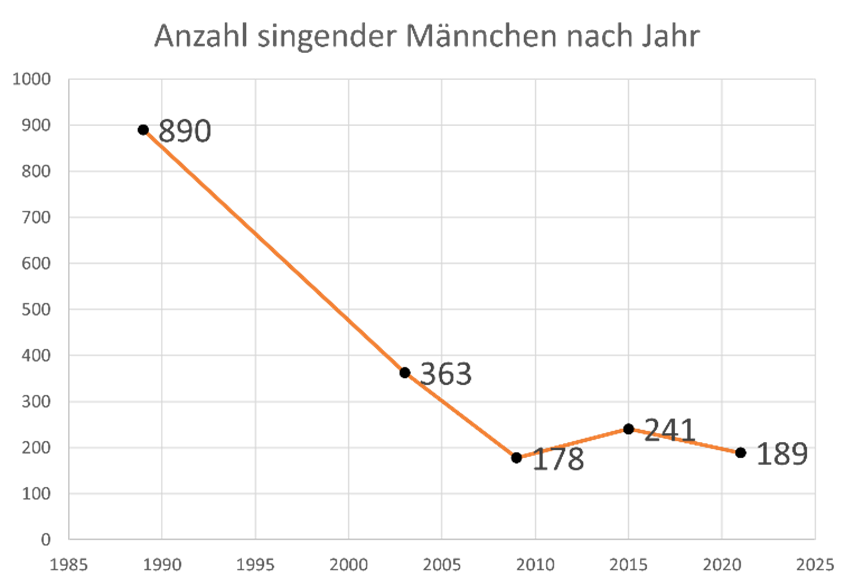 Dieses Ergebnis an sich ist erstmal kein Grund zur Freude und eine derart deutliche Abnahme klingt alarmierend. Dennoch liegt das Ergebnis der diesjährigen Kartierung immer noch über dem von 2009. Hätte sich die Kurve weiter so steil nach unten bewegt wie zwischen 1989 und 2009, wäre der Ortolan bei uns bereits ausgestorben. Deshalb ist allein die Tatsache, dass wir diesmal mehr Ortolane als vor 12 Jahren feststellen konnten, ein bemerkenswerter Erfolg.