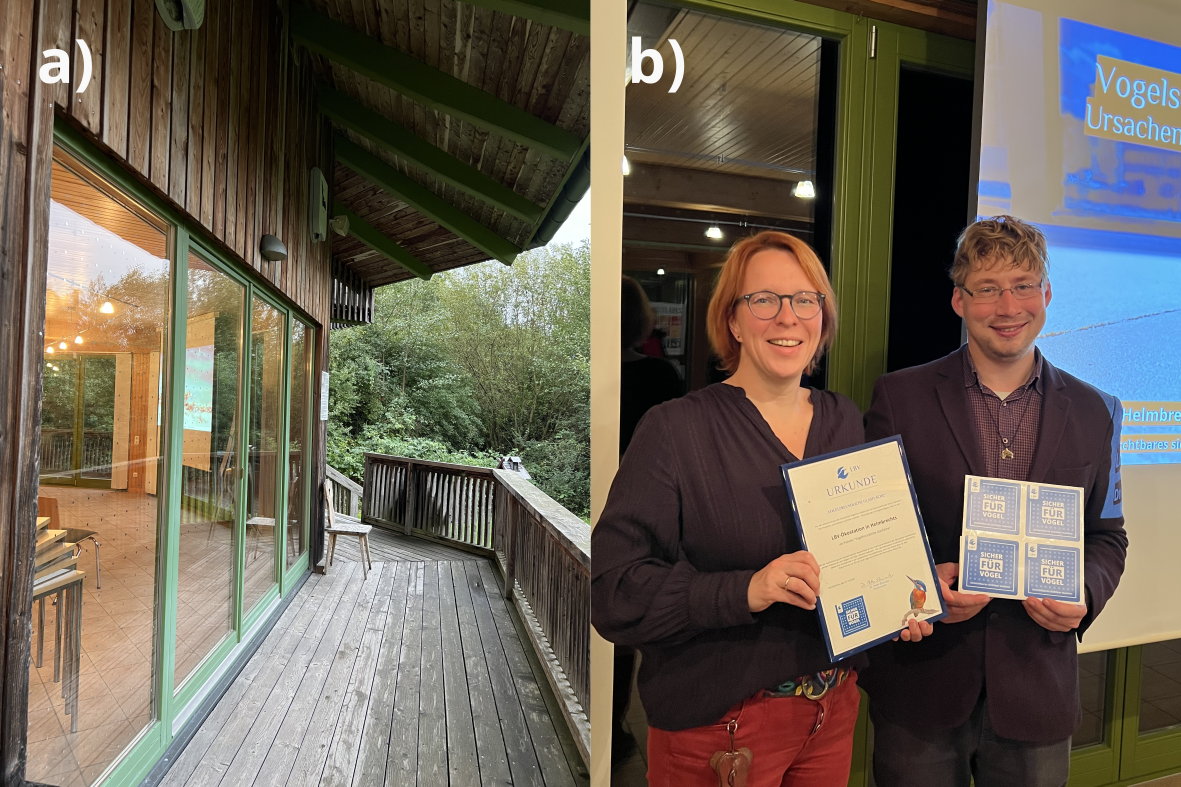 An den Scheiben des Seminarraums der LBV e.V. Ökostation Helmbrechts wurden immer wieder Vögel gefunden, unter anderem ein Sumpfrohrsänger (Acrocephalus palustris), der 2021 in Estland beringt wurde. Bei einer Besichtigung vor Ort im Januar 2025 wurden als Risiko neben den umgeben den Gehölzen vor allem die Futterstation ermittelt. Daraufhin wurden von der LBV-Stiftung Bayerisches Naturerbe die Fördermittel zur Nachrüstung von ca. 50 m² SEEN-Elementen bewilligt, die über den LBV-Naturshop im Sommer 2025 nachgerüstet wurden (siehe Abb. a). Hierfür wurde die Station am 07.08.2025 mit der Plakette Vogelfreundliche Glasfläche ausgezeichnet (siehe Abb. b). Weiterhin wurde ein Vortrag zu den Ursachen von und Handlungsmöglichkeiten gegen Vogelschlag an Glas gehalten. Im Auditorium waren vor allem Angestellte des LfU vertreten.