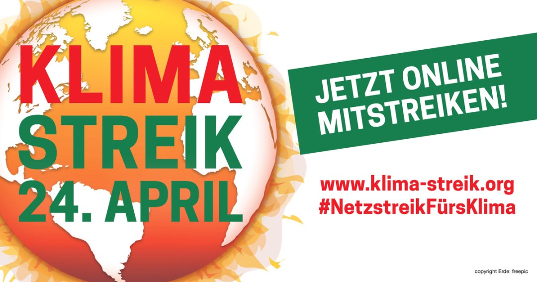 Am Freitag den 24. April um 12:00 Uhr startet der Livestream von Fridays for Future mit Konzerten, Schaltungen zu Ortsgruppen und internationalen Gästen sowie verschiedenen Mitmach-Formaten. Jede*r kann mitmachen und den eigenen Protest auf der Streikenden-Karte im Internet eintragen.