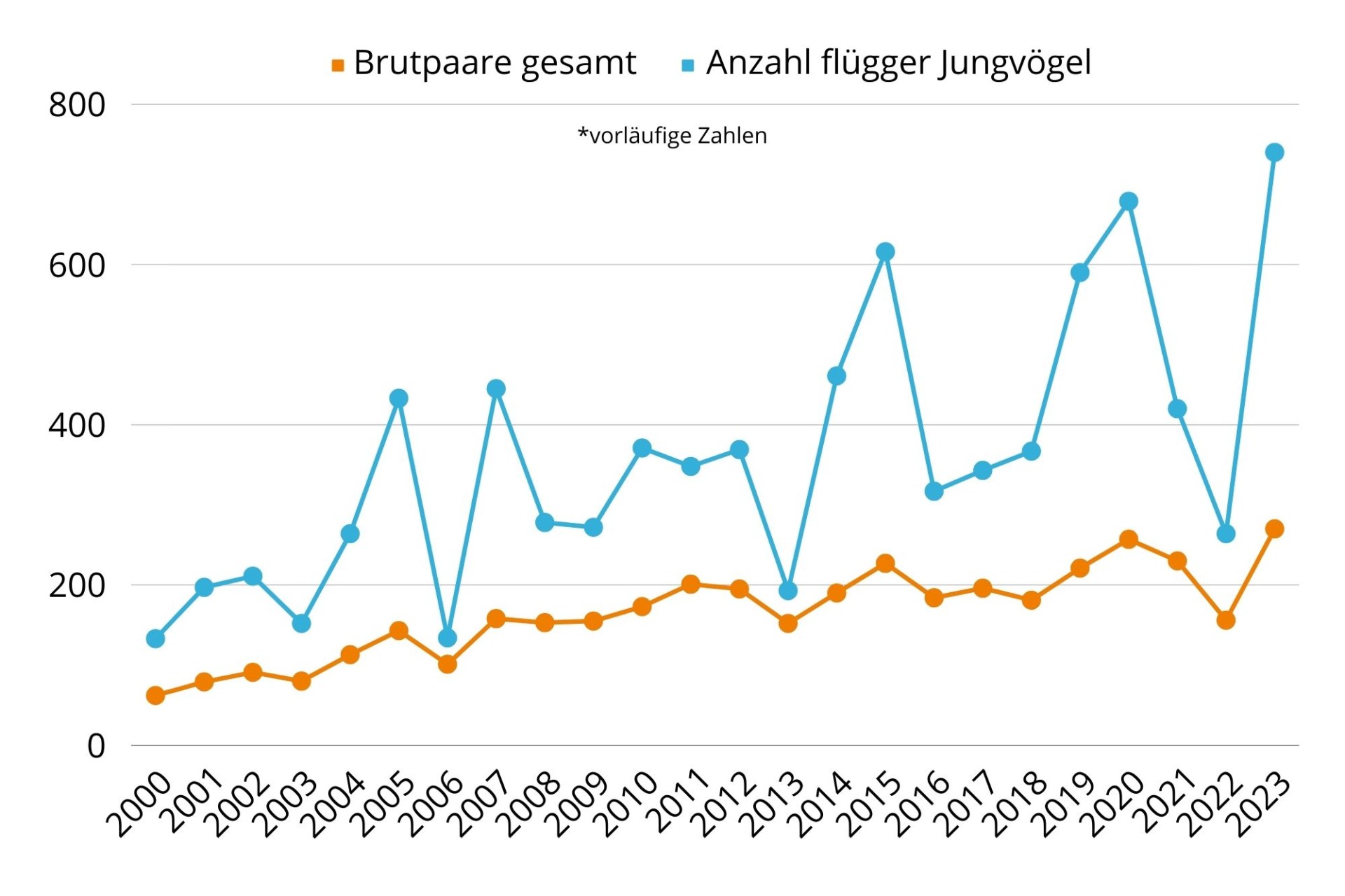 2022 registrierten die Ehrenamtlichen mit 264 flüggen Jungvögeln und 156 Brutpaaren noch einen drastischen Rückgang der Brutzahlen des stark gefährdeten Greifvogels. Schwankungen in den Brutzahlen sind bei der Wiesenweihe grundsätzlich normal, da die Feldmausbestände ebenfalls natürlichen Schwankungen unterliegen. Doch normalerweise erholen sich die Populationen nur schrittweise über ein paar Jahre hinweg. Deshalb kam der rapide Anstieg der Brutzahlen im Vergleich zum Vorjahr für die Projektverantwortlichen 2023 völlig unerwartet.