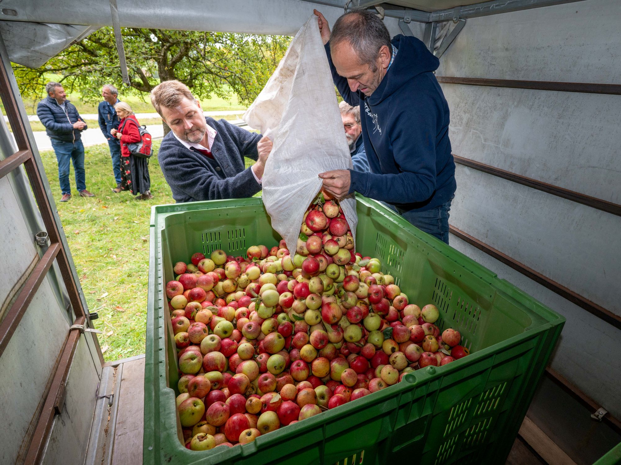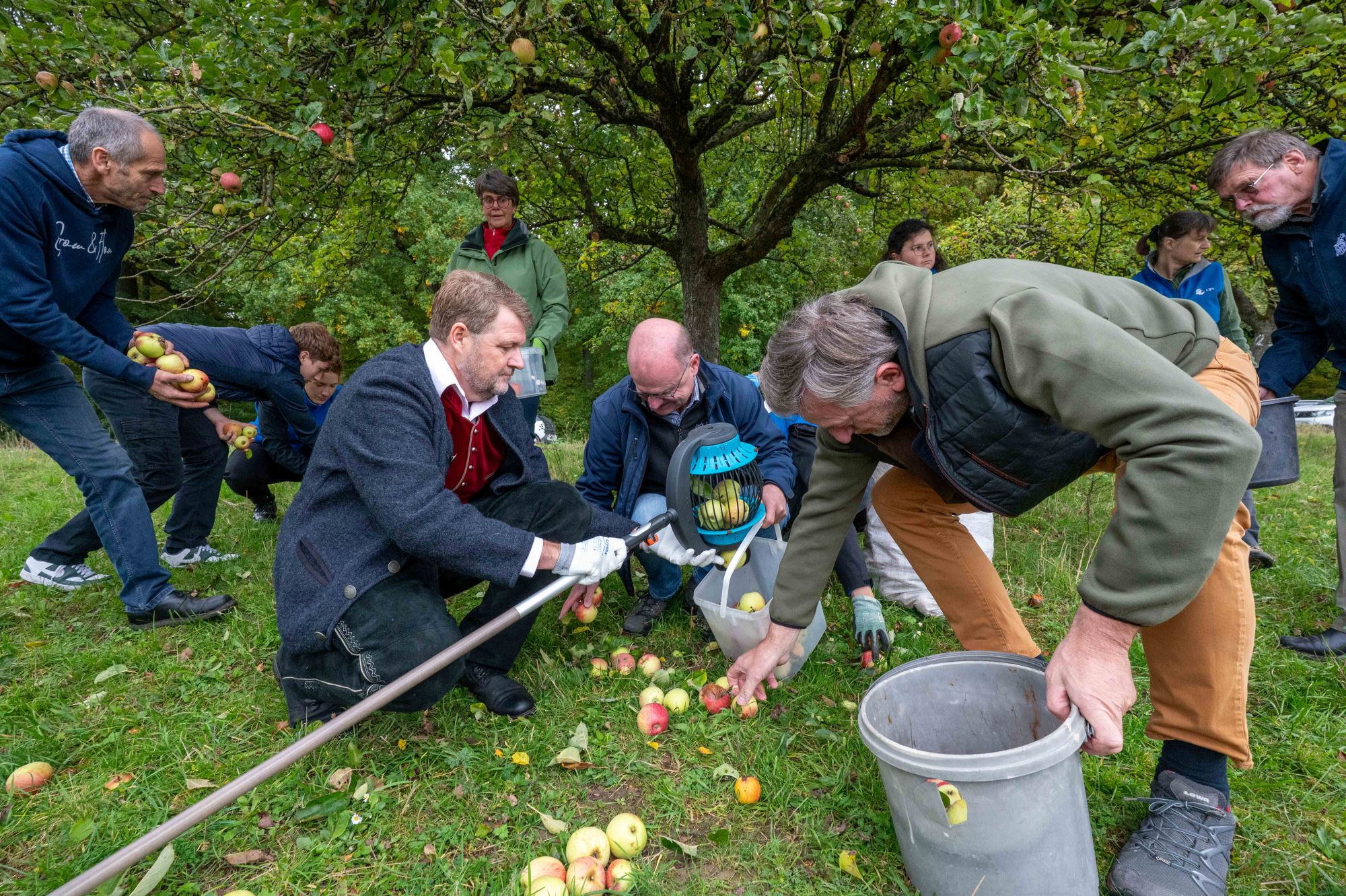 Die Bayerische Streuobstbäume ächzen in diesem Jahr ganz besonders unter der Last von köstlichen Äpfeln, Birnen, Zwetschgen und anderen Früchten. Doch viel zu oft bleiben die wertvollen Rohstoffe ungenutzt liegen, während die Verbraucher im Supermarkt Saftkonzentrat von Äpfeln aus anderen Erdteilen kaufen. Um darauf aufmerksam zu machen, haben die Unterzeichner des Bayerischen Streuobstpaktes heute auf einer Streuobstwiese in Eysölden (Lkr. Roth) gemeinsam Äpfel gesammelt und zu einer Mosterei gebracht.