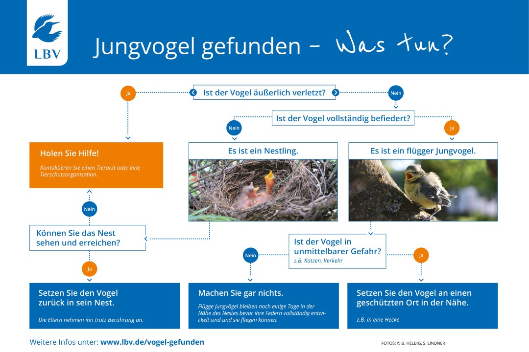 Sie haben einen Jungvogel außerhalb seines Nests gefunden? Hier erfahren Sie was zu tun ist. Viele gefundene Jungvögel sind nämlich nicht so eltern- und hilflos, wie sie auf uns Menschen wirken. In einem kostenlosen Faltblatt erfahren Sie zudem weitere hilfreiche Tipps.