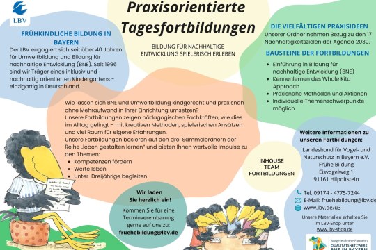 Für Lehrkräfte an Schulen bieten unsere Umweltstationen Fortbildungen und Informationsveranstaltungen zum Erwerb von Arten- und Biotopkenntnissen sowie Seminare und Informationsveranstaltungen zu diversen Umwelt- und Lebensstilthemen wie Ernährung, regenerative Energie u. ä. an. Die Fortbildungen können auch von anderen Personengruppen in Anspruch genommen werden. Immer wieder finden Sie auch Veranstaltungen, zu denen sich Einzelpersonen anmelden können. Details dazu finden Sie in den Programmangeboten der einzelnen Umweltstationen. Auch unser LBV-Veranstaltungkalender hält jede Menge spannender Themen für Sie bereit.