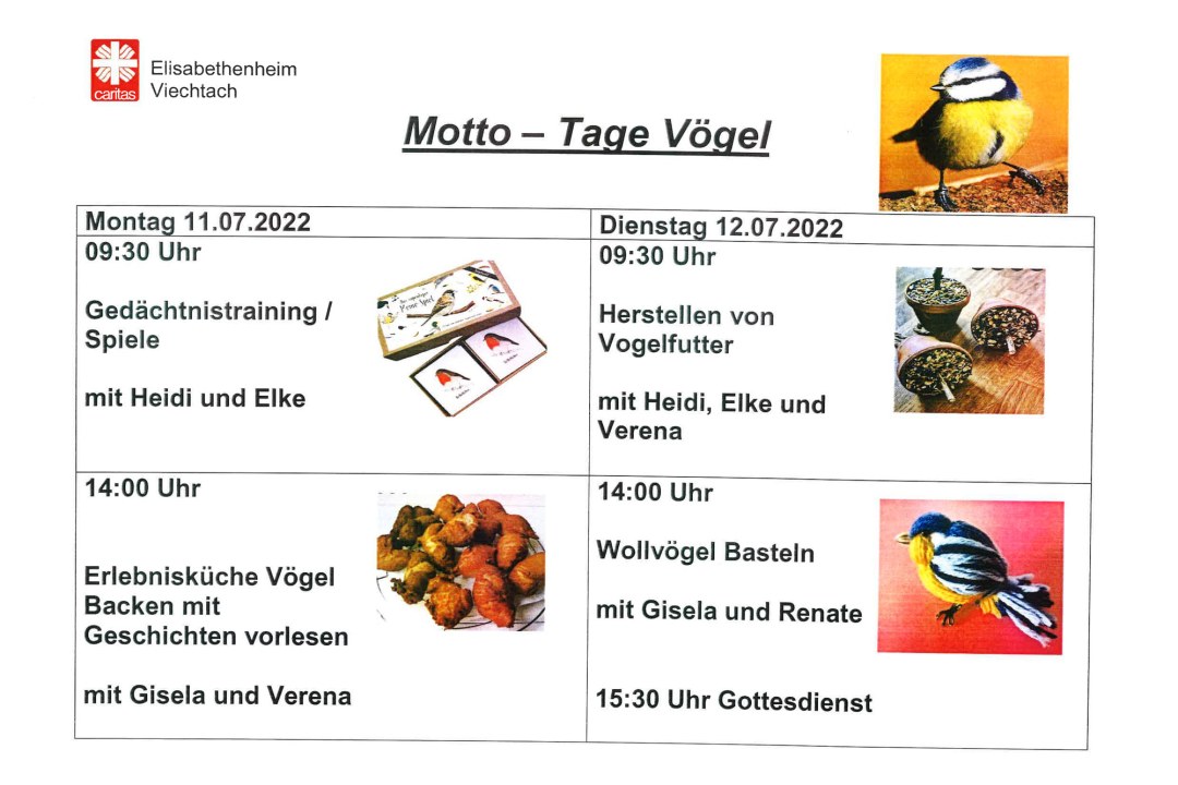 Bei den Motto-Tagen im Caritas Elisabethenheim in Viechtach dreht sich am 11. und 12. Juli alles rund um das Thema Vögel. Hier werden mit Spiel und Spaß kognitive und motorische Fähigkeiten der Senior*innen unterstützt – und nebenbei entstehen schöne, nützliche und wohlschmeckende „Vogel-Werke“