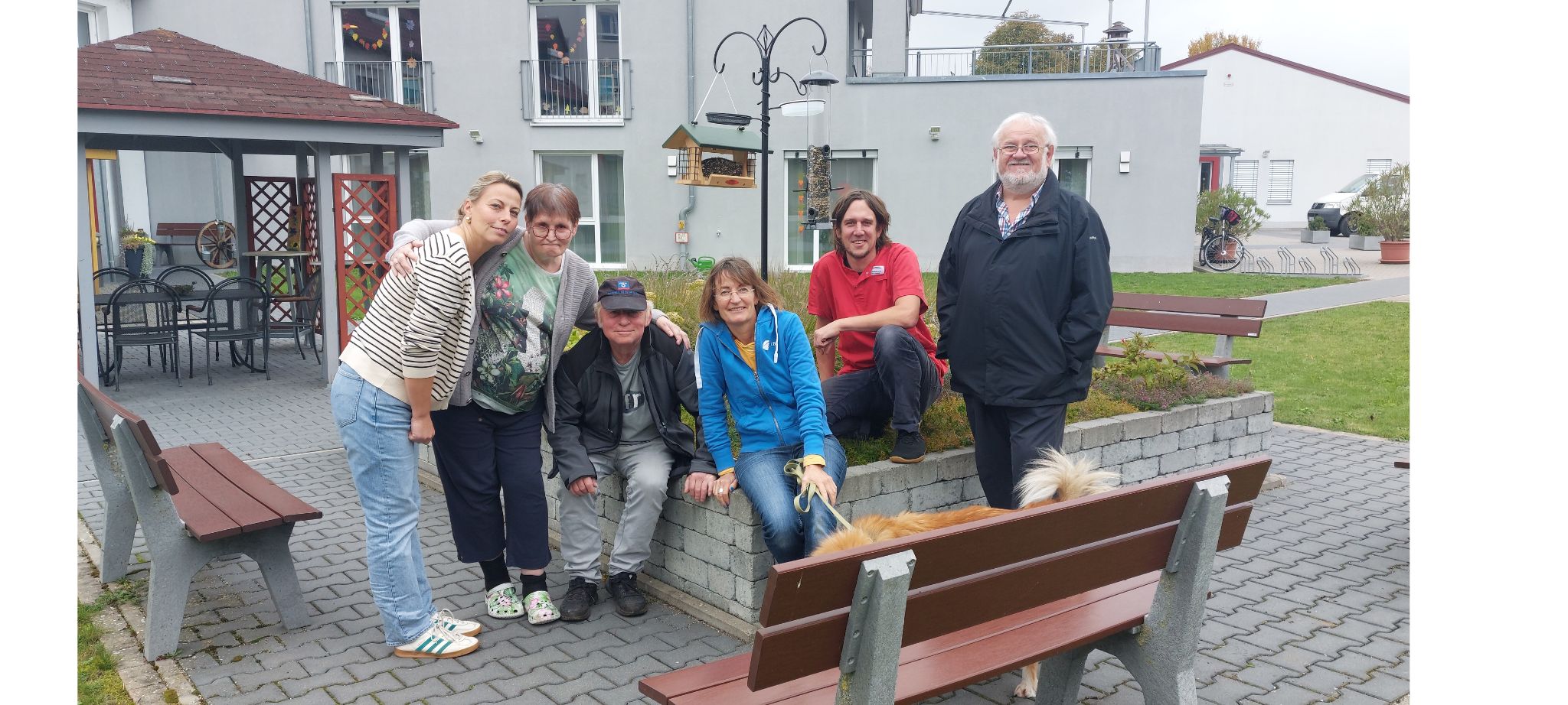 Bei noch herrlichem Spätsommerwetter ließen es sich viele SeniorInnen nicht nehmen, auch beim Aufstellen und Befüllen der Futterstation mit nach draußen zu kommen. Selbst der „Einrichtungs-Hund“ Tammi ist sehr interessiert dabei.